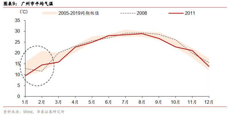 近二十年中仅07-08年和10-11年的拉尼娜事件达到了中等强度,最可能属于冷冬年。我们观察广州市08年与11年初的气温处在历史(2005-2019年)极值下界,亦佐证冷冬。本文我们将2007.12-2008.2和2010.12-2011.2定义为冷冬时期,以此分析对经济影响。