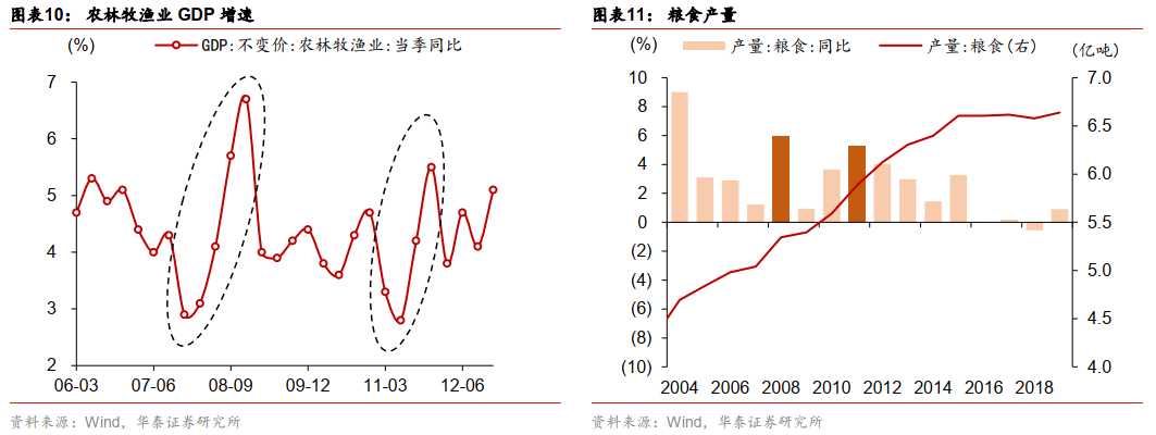 简言之,冷冬易对当期(主要是一季度)农业生产造成负面冲击,但有利于开春后的农作物与蔬菜瓜果等生长发育,2008年与2011年粮食产量增幅为近二十年的两大高点。结构上,对林/牧/渔业影响偏负面,而对农业利弊并存,粮食作物所受冲击弱于经济作物。