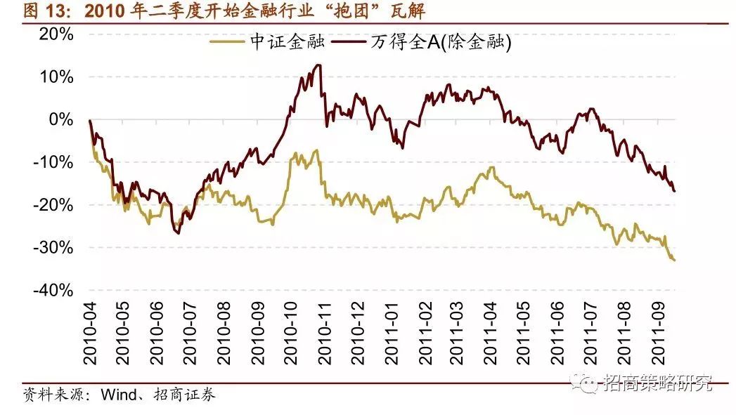 2010年二季度开始,金融的抱团瓦解,接下来一年半,让我们见识了抱团崩坍的结果,到自2010年4月中旬开始,到2011年7月中旬,金融指数整体下跌了20%,而同期剔除金融的指数居然还上涨了2%。到11年9月底,金融指数跌幅已经超过了30%。
