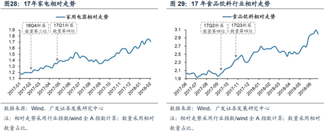 在17年通过净利润断层个股相对数量占比靠前可筛选出家电和食品饮料,均明显跑赢市场平均水平。