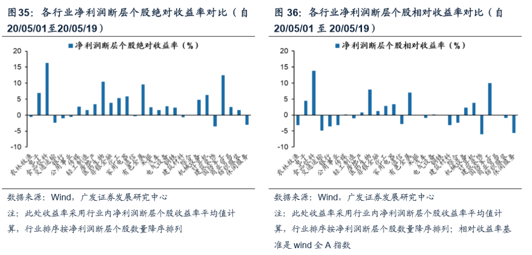 从收益率视角看,20Q1净利润断层个股相对数量占比前三名行业农林牧渔、电子、食品饮料,其中电子和食品饮料行业净利润断层个股收益率平均来看在今年5月初以来均取得绝对收益和相对收益。20Q1财报季净利润断层个股相对数量占比靠前的行业是农林牧渔、电子、食品饮料等。自20Q1财报季公布完毕后,从5月1日至5月19日,除农林牧渔外前三个行业的净利润断层个股收益率平均值,无论是绝对收益维度还是相对收益维度均为正,前三行业中仅农林牧渔取得负收益。另外,净利润断层个股相对数量占比居前的食品饮料行业成为收益率最高的行业,说明依靠净利润断层策略更容易筛选出业绩增长势头较好的行业。