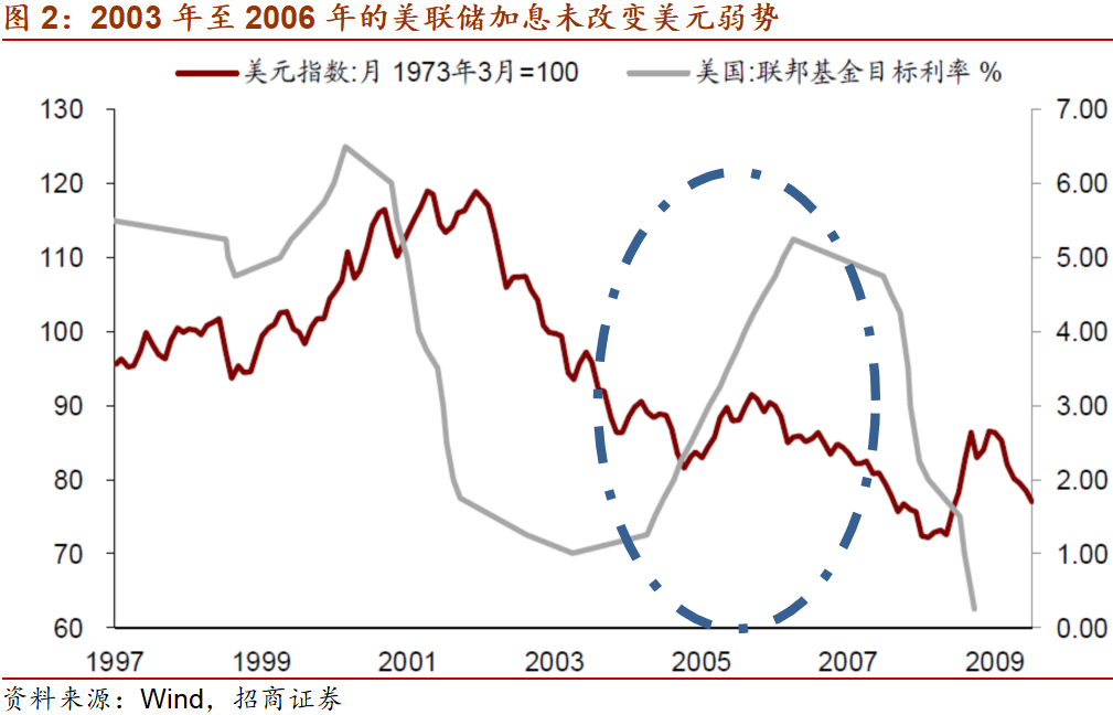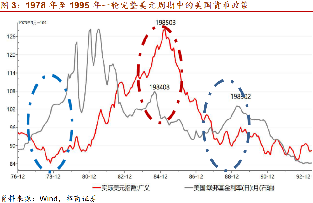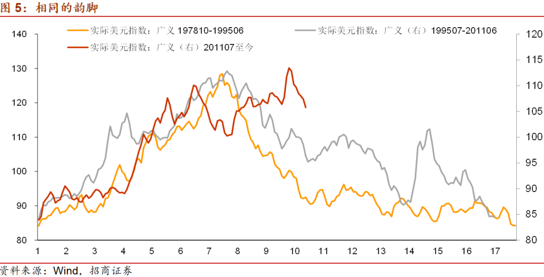 图3和4可见,一轮完整的美元周期中包含2至3轮美国的货币政策周期。美元的转强出现在美联储加息的中后期,但并非每次美联储加息都会带来美元走强;美元的走弱以美联储的大举宽松为前提,但并非每次美联储宽松都带来美元的走弱。