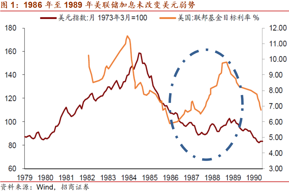 答:美元周期时长16至18年,属于金融周期的性质。美国的货币政策周期一般6年左右,是经济周期(Business Cycle)性质。一轮完整的美元周期包含3次美国的货币政策周期:例如2020年开始美国货币政策宽松,美元进入9年左右的弱势;在此过程中,美联储收紧和放松货币政策都不会显著改变美元的弱势,就如1986年至1989年和2003年至2006年一样。换句话说,美元周期不简单等同于美国货币政策周期,但美国货币政策对美元的强弱转换很重要。