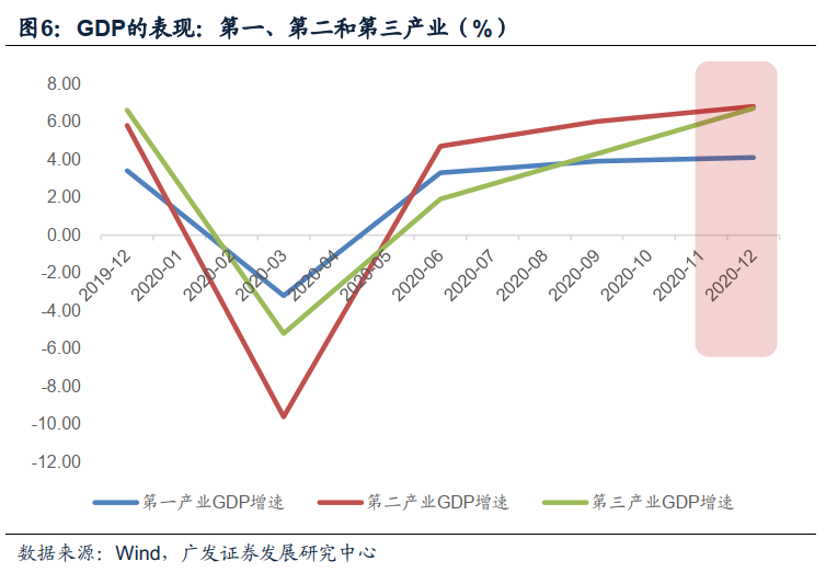 四季度GDP同比增速为6.5%,略高于预期。主要是第三产业GDP增速达6.7%(二季度为4.3%)。这意味着对第三产业来说,房地产、信息软件、金融等“硬服务业”领域的高景气弥补了批零、交运、住宿餐饮等“软服务业”领域。经济在下一阶段的带动力量将主要是全球贸易、制造业,以及“软服务业”领域的修复。