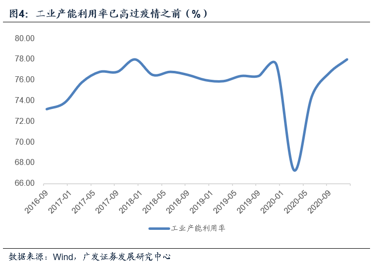 第四,固定资产投资继续回升至全年累计增速近3%。从12月单月来看,基建、房地产均有所减速,而制造业投资增速上升幅度较大。值得注意的一个细节是,工业产能利用率仍在继续上升,且同比上升幅度进一步拉大。在产能利用率偏高的背景下,若2021年需求端进一步好转,则制造业会大概率增加资本开支。