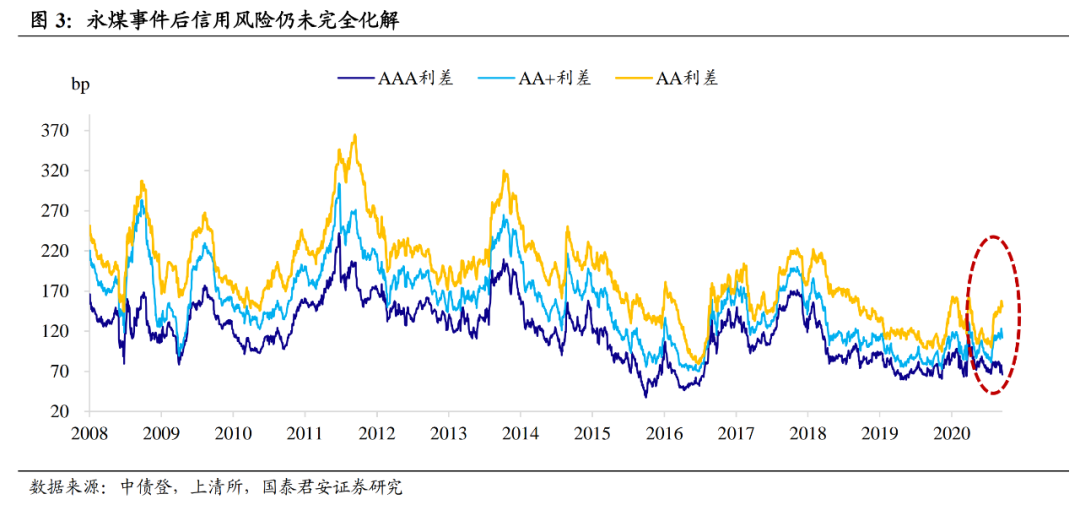 信用冲击仍未结束,货币收紧的依据并不充分。永煤事件至今,高等级利差收窄,其他评级利差大幅走扩,一级市场信用融资功能部分丧失、二级市场防风险继续抛售弱资质主体,市场仍未找到化解信用风险的方法,此时贸然收紧货币的可能性不大。
