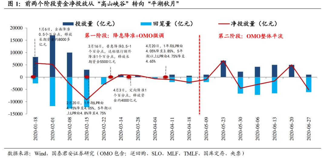 第一阶段:降息降准为主,公开市场点缀,债券大牛市。2.3-4.30共63个交易日,逆回购仅10次,但期间3次降准、3次增加再贷款再贴现,合计净投放23587亿,公开市场操作只起到局部微调的作用。