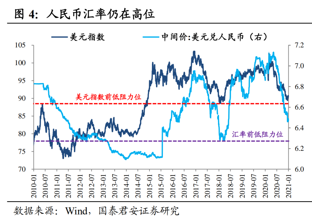 美元指数触底,但人民币汇率仍在历史高位。2021年1月6日美元指数89.41,逼近2018年1月26日的低点89.02,美元指数下行遇到阻力位。但美元对人民币中间价触及6.46后并未明显回调,目前依然维持在相对高点,高汇率压力依然不减。