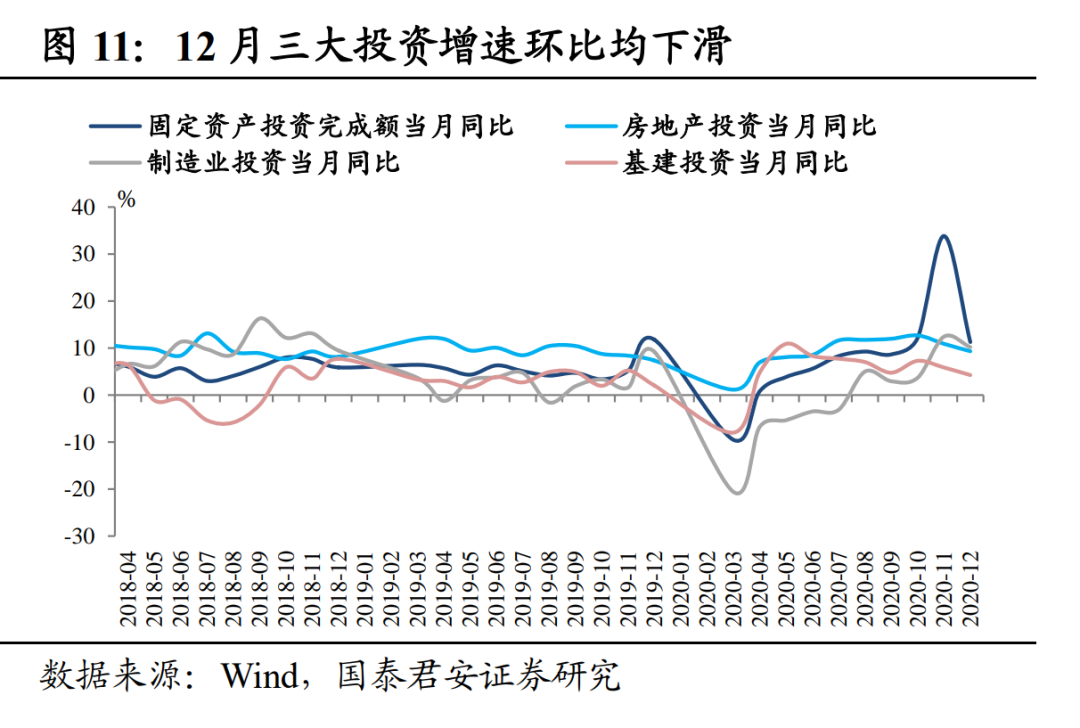 2021Q1经济向上超预期的动能弱化。12月当月基建、房地产、制造业投资增速分别环比回落1.6、1.6、2.2个百分点,三大投资增速环比均出现回落,消费复苏再次弱于预期,市场可能低估了疫情反复对经济复苏的影响。