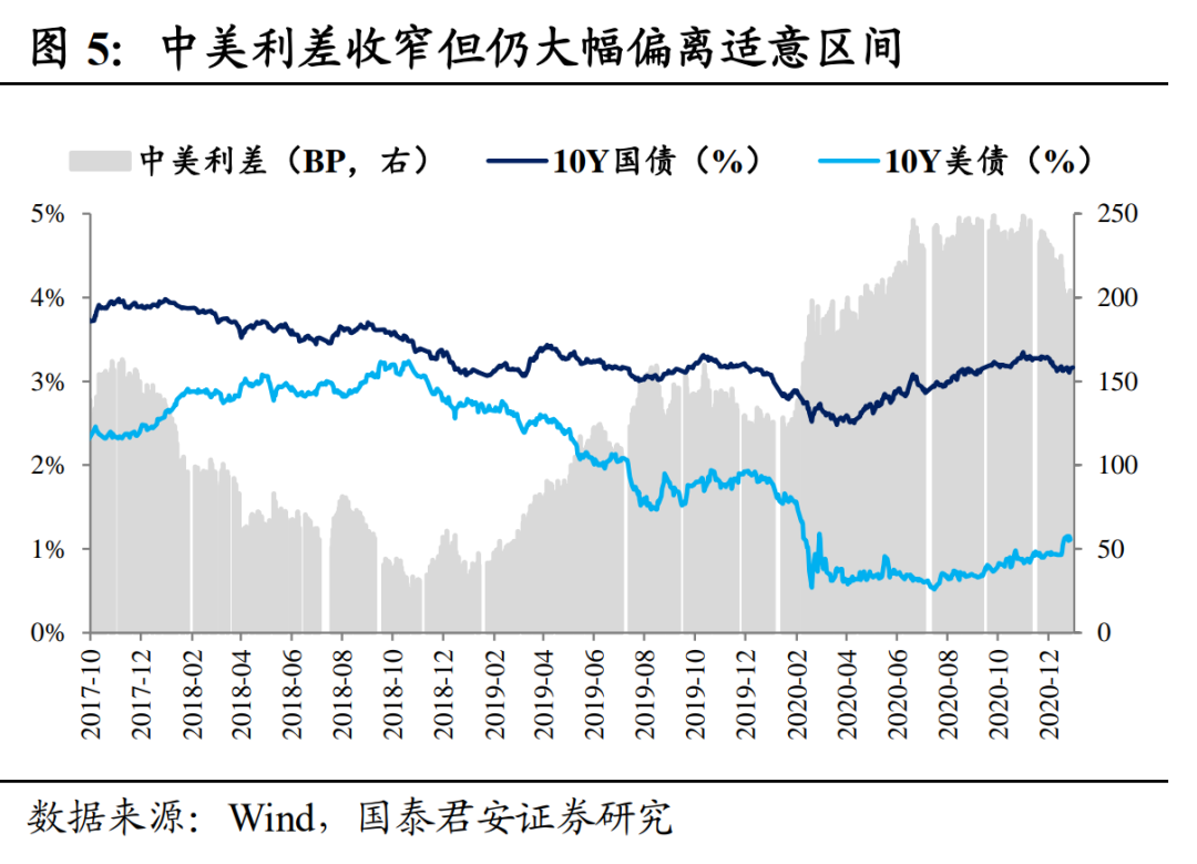 中美利差有所收窄,但仍大幅偏离适意区间。蓝营横扫带动10Y美债收益率破“1%”,中美10Y国债利差由高点249BP下行至1月14日的195BP,但距离80-100BP的适意区间仍有很长的路要走,当前还没有收紧货币的必要。