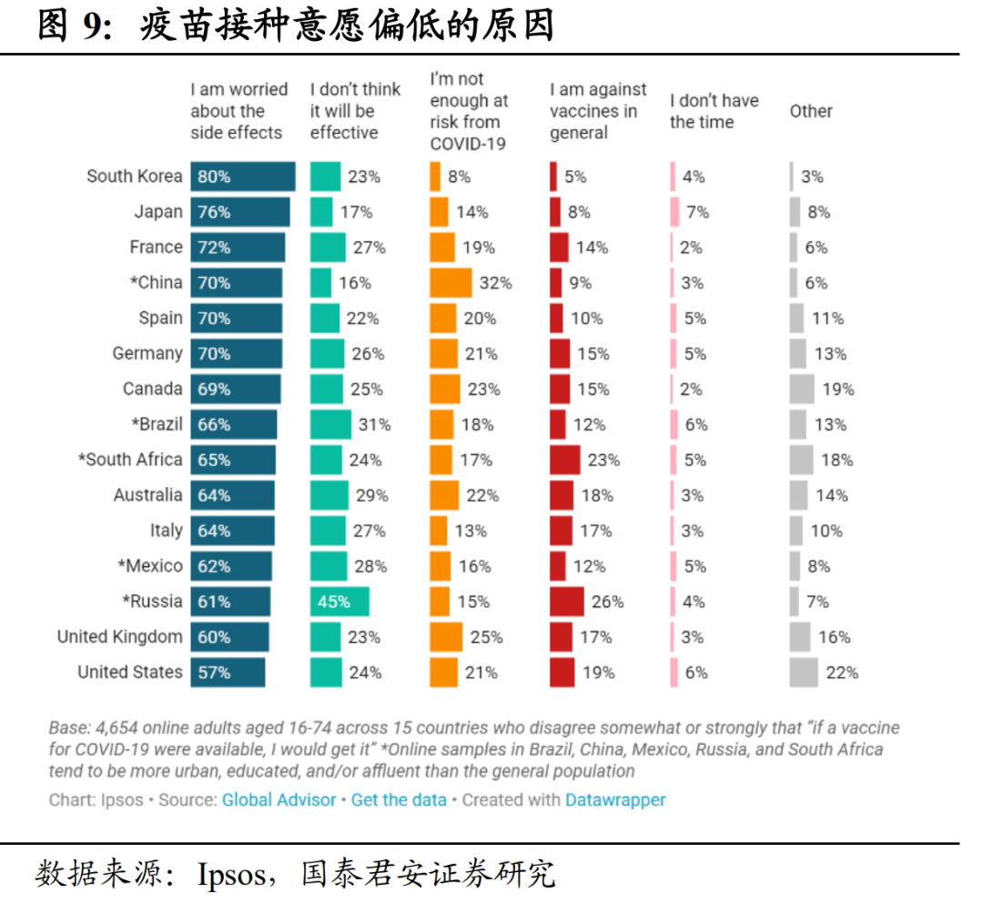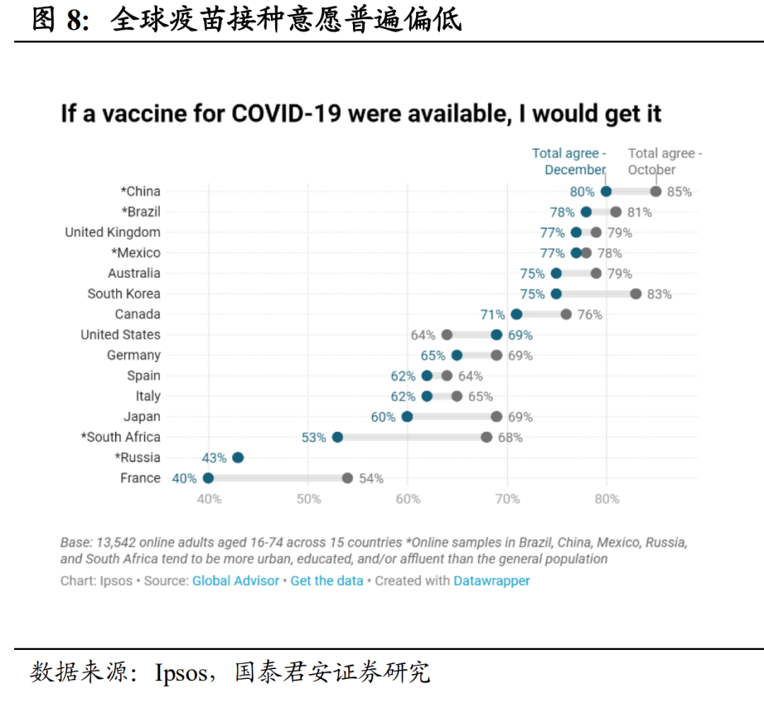 疫情防控趋严,疫苗注射可能不及预期,拖累经济复苏。近期河北、黑龙江等地疫情再起,疫情防控再次收紧,引发市场对基本面复苏的担忧。此外,疫苗注射可能不及预期,根据Ipsos的调查统计,全球疫苗接种意愿最强的中国接种意愿为80%-85%,美国接种意愿64%-69%,法国接种意愿最低,仅40%-54%。发达国家接种意愿普遍较低,主要是对疫苗副作用和有效性存疑,而疫苗注射不及预期可能继续拖累全球基本面复苏。