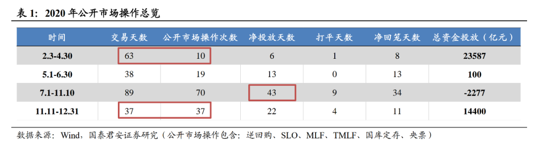 回顾2020年,如果只考虑公开市场操作,2月3日至12月31日净投放仅304亿元,看起来资金面无波澜,但分阶段来看,全年流动性分布并不均匀。考虑到2-4月3次降准共释放1.75万亿资金、3次再贴现再贷款共释放1.8万亿资金,综合计算,2-4月,5-6月、7-11月、12月分别净投放23587亿元、100亿元、-2277亿元和14400亿元,明显分化出“丰→平→乏→丰”四个阶段。