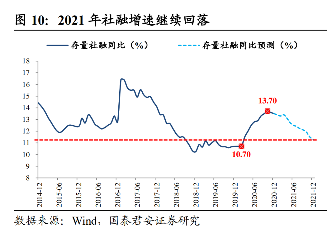 社融加速下滑推升基本面压力。12月存量社融增速13.3%,环比回落0.3个百分点,受政府债券和信用债缩量拖累,预计2021年1月社融增速继续回落至13%左右。金融数据具有先导性,社融的加速回落可能预示未来经济环比增速可能出现一定幅度滑坡,基本面压力加大。