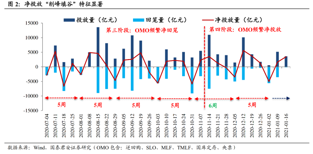 永煤事件冲击后,GC007天量成交+11月MLF意外投放+12月MLF超量投放,“削峰填谷”周期由之前规律的5周延长至6周,资金回笼节奏明显放慢,带动12月宽松小周期出现。