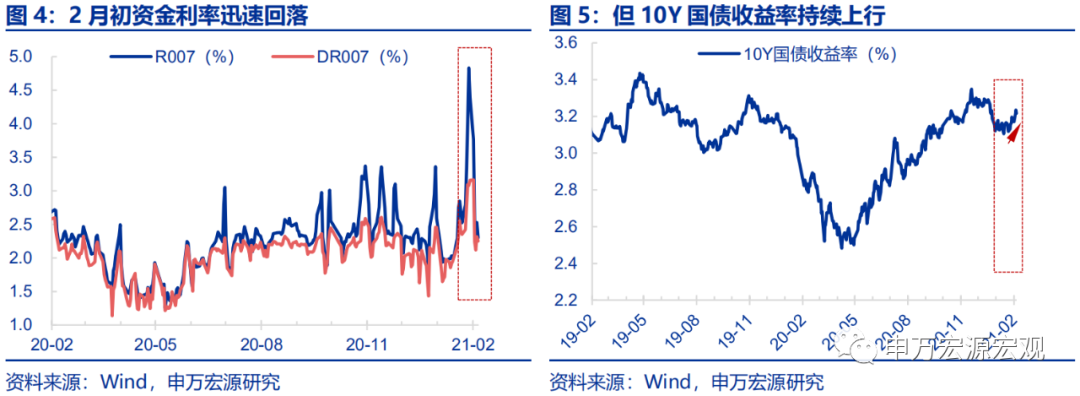 (4)春节前仅剩的三个工作日,央行会如何操作?2月的货币需求缺口仍然较大,央行如果不愿降准,则可能需重启28天以上逆回购,大规模投放约9000亿,并在此基础上,再净投放MLF5000亿,还需辅之以相对较大规模的现金投放。时至2月初,银行间资金面利率又出现了快速的回落(DR007于2月2日单日回落就高达90BP),但其原因并非央行的逆回购大规模投放(2月1日-2月7日央行合计仅净投放1460亿逆回购),而是财政支出可能仍在持续而导致短端流动性紧张暂时性缓和,长端利率的上行显示中长期流动性仍相对紧缺,10Y国债收益率持续上行,2月4日报收3.2347%,商业银行用于信用扩张的中长期流动性依然较为紧张。