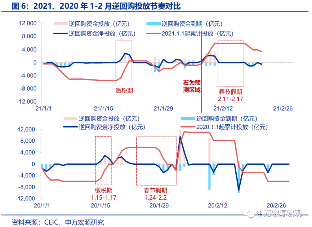 首先,我们预计央行有望时隔一年半重启28天逆回购,以提供跨春节前后,并且能够跨越2月的资金支持。今年春节横跨了MLF投放时点、并且假期结束就连着缴税时点,而增加了央行操作的复杂性,短期流动性缺口和中长期缺口均较大;而与之相比,2020年春节处于1月下旬、2月初时点,操作难度其实较小。但即使是在2020年1月春节前,央行也进行了较大规模的一轮节前逆回购投放,且当时1月初有过降准,商业银行超储率较高,故而2020年并未如此前年份般,在春节前进行28天期或更长时间的逆回购操作。而今年央行春节前至今为止的投放规模很小,且多为节后即时到期,无法接续2月缴税期的流动性压力,因而凸显出短期流动性缺口之大。考虑到当前既有的逆回购在2月底前仍有高达5300亿的到期量,我们预计央行在节前的未来三天,需重启28天逆回购,并日均需投放约3000亿、合计投放9000亿跨月资金,以利于平滑后续的缴税期月内扰动。