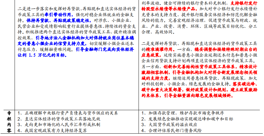响应十九届五中全会“做好碳达峰、碳中和工作”的要求,央行在专栏2中表态落实相应目标,将发挥好金融支持绿色发展三大功能,完善绿色金融体系五大支柱,完善绿色金融政策框架和激励约束机制,用好结构性货币政策工具,引导金融机构按照市场化原则支持绿色低碳发展。