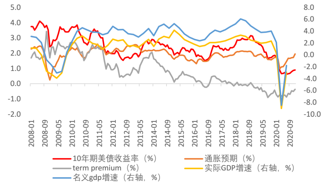 图1:美债收益率与名义GDP、实际GDP、通胀预期、期限偏好 |