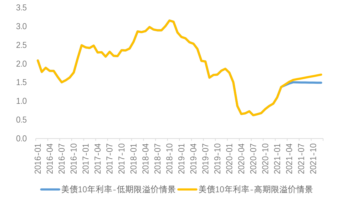 2. 短端实际利率受全要素生产率、劳动供给、储蓄率等多个变量的影响,在实际预测中难以估计,因此用短期货币政策利率代替。从最新的点阵图看,美联储在2023年之前不加息,预计短端实际利率将维持在当前位置不变。