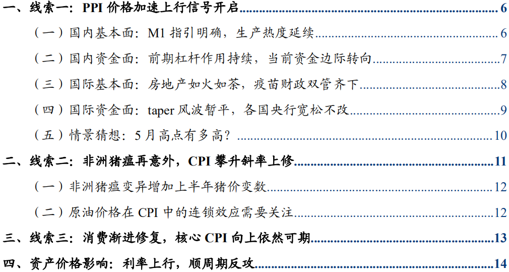 根据PPI 宏观四象限模型,PPI 加速上行信号已经开启,PPI 成为2021年通胀年的首条线索。以全球宽松流动性为土壤,以海内外前后开启库存周期为支撑,再以疫苗接种及财政刺激的进展为信号,宏观组合在需求侧推动大宗商品价格加速上涨的逻辑已经明确。预计5 月PPI 高点区间应在5%-6.5%左右。