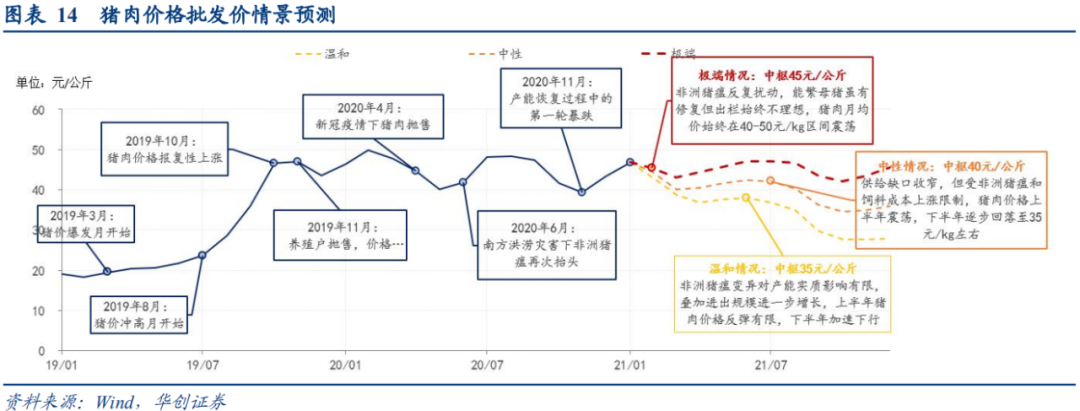 如何理解非洲猪瘟变化可能对猪价带来的变数?春节前,养殖户本身就有响应需求增加供给的意愿,叠加非洲猪瘟疫情影响,提前出栏的情况较多,导致1月下旬以来价格快速下行。春节后,预计4-6月猪肉价格再次回涨(当下50-80公斤存栏下降影响3月底出栏,同时夏季高温多雨为南方疫病高发期),7-10月猪肉价格加速回调(生猪产能修复,疫病干扰少),11-12月价格再次上行(当下能繁母猪存栏下降影响2021年底生猪出栏,冬季为北方疫病高发期)。