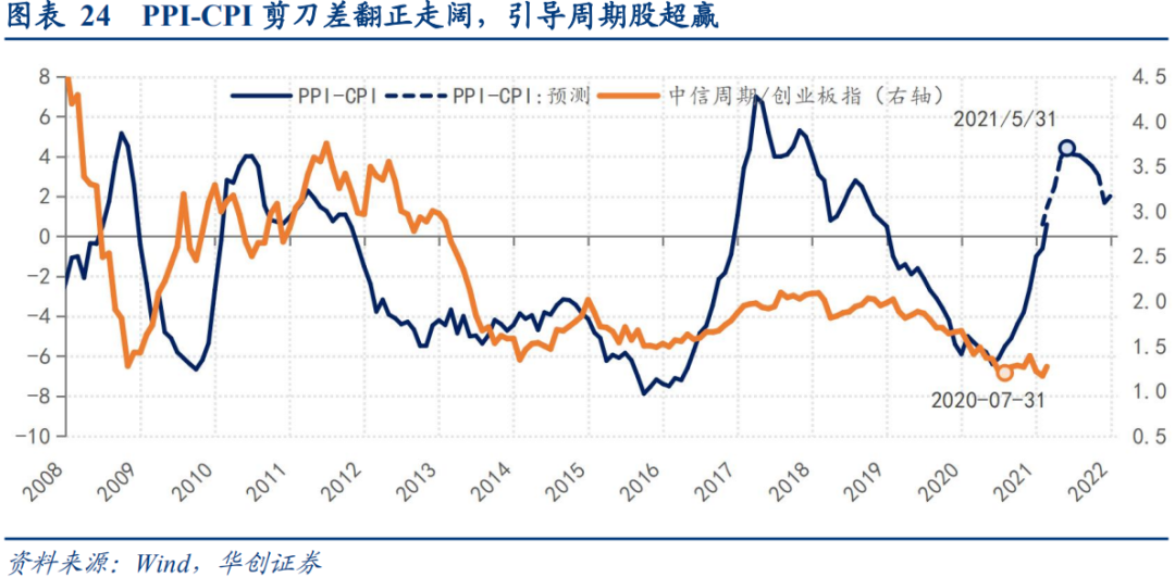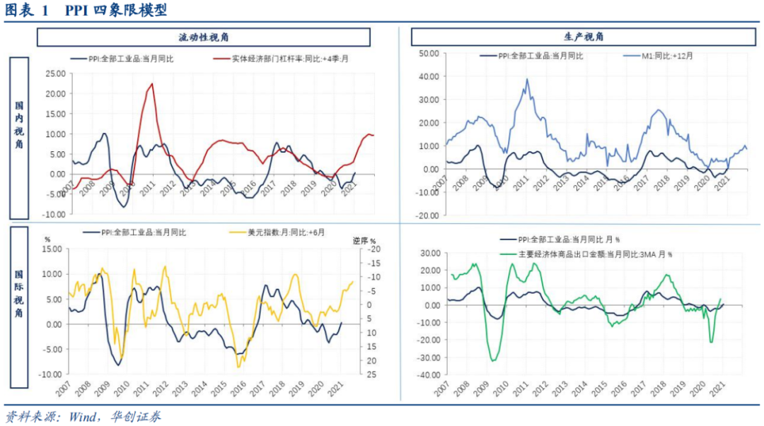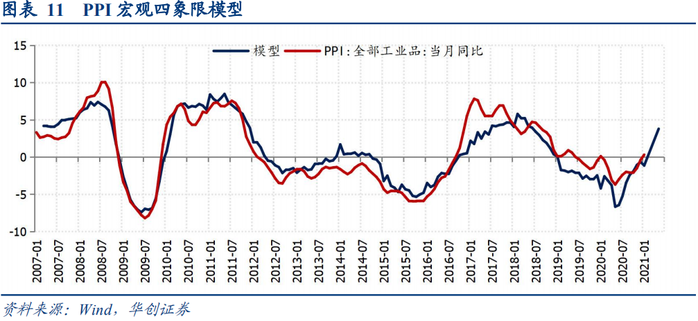 自上而下,根据宏观四象限模型,2021年的PPI高点有望接近2017年高点水平,预计5月高点在6%左右。