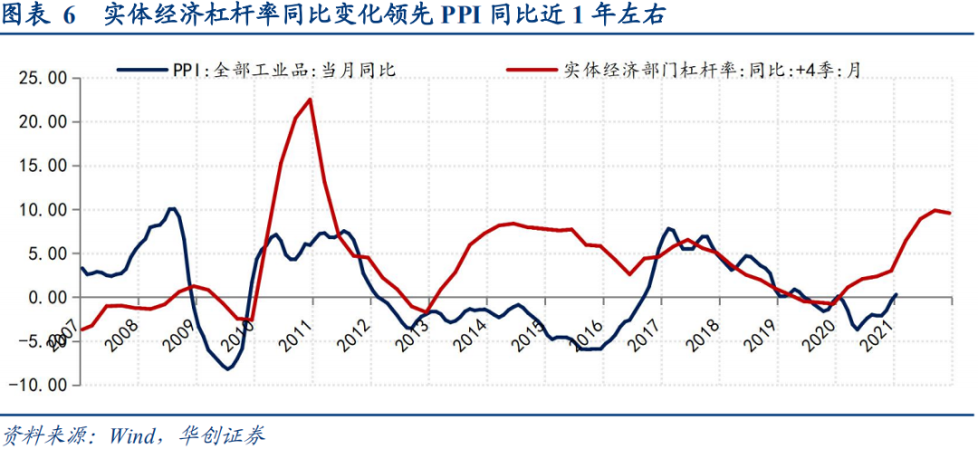 作为资金作用的领先性指标,我们在四象限模型中以实体经济宏观杠杆率来前瞻资金驱动的投资意愿——基建(政府杠杆驱动)、制造业(企业杠杆驱动)、房地产投资(企业杠杆和居民杠杆驱动)。按照1年左右的领先度,2020年宏观杠杆率的快速抬升(23.6个百分点),同样意味着2021年初PPI将开启加速上行。
