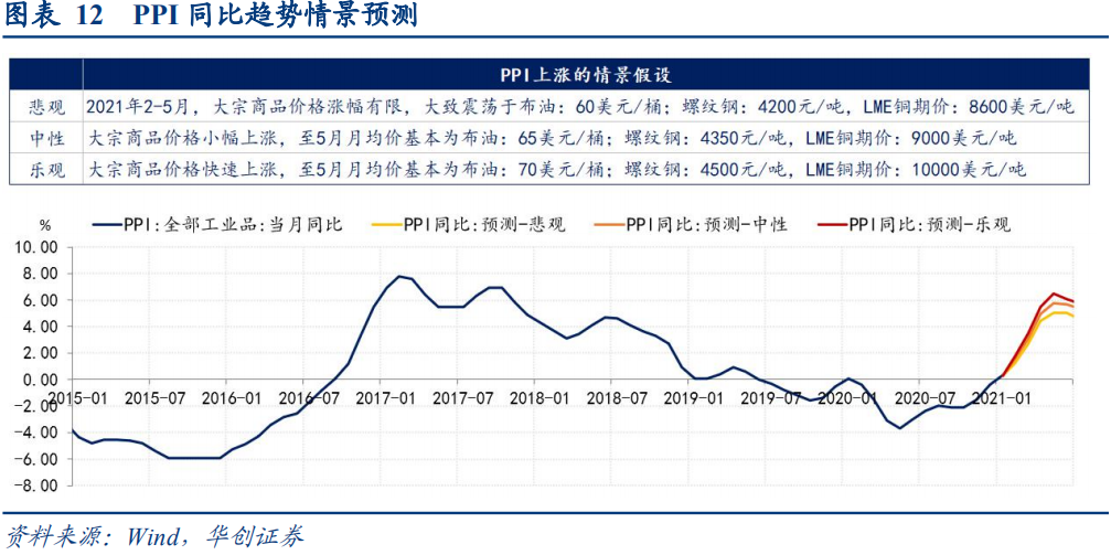 自下而上,根据三类大宗价格的不同情景做推算,2021年的PPI高点区间应在5%-6.5%左右。这里我们主要是参照了2016年和2017年三类大宗价格上涨对PPI环比的拉动。