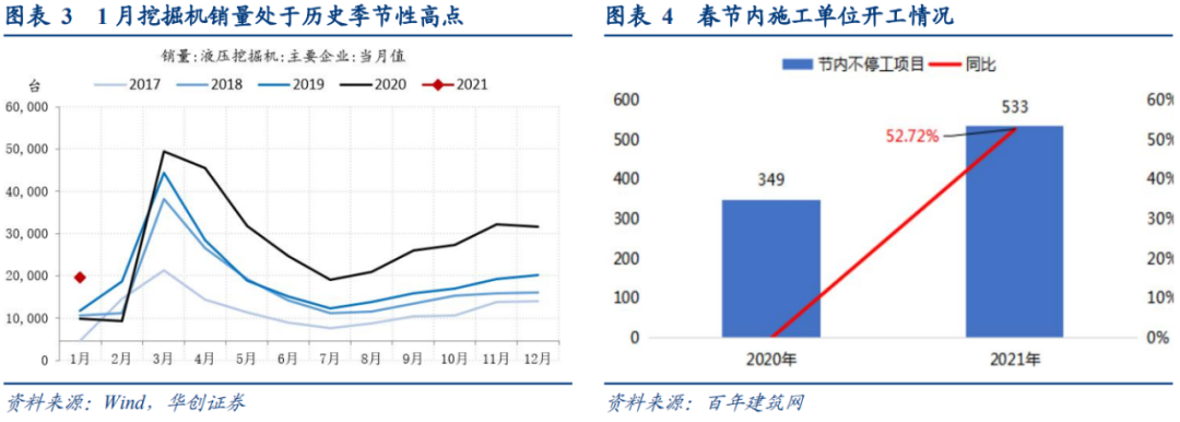 当下,尽管二次疫情和就地过年对工业生产、建筑施工形成一定的负面影响,但目前来看影响有限,更多的是短期扰动,而不改变中期生产积极的态势。譬如部分生产信号:1、挖机销量处于历史季节性的最高点,对比2020年同比增长97%,对比2019年同期增长67%;2、工业机器人产量12月同比增长32.4%;3、租赁塔吊吨米使用率接近2019年同期;4、春节内建筑不停工项目同比增长53%。