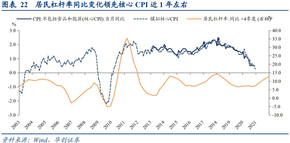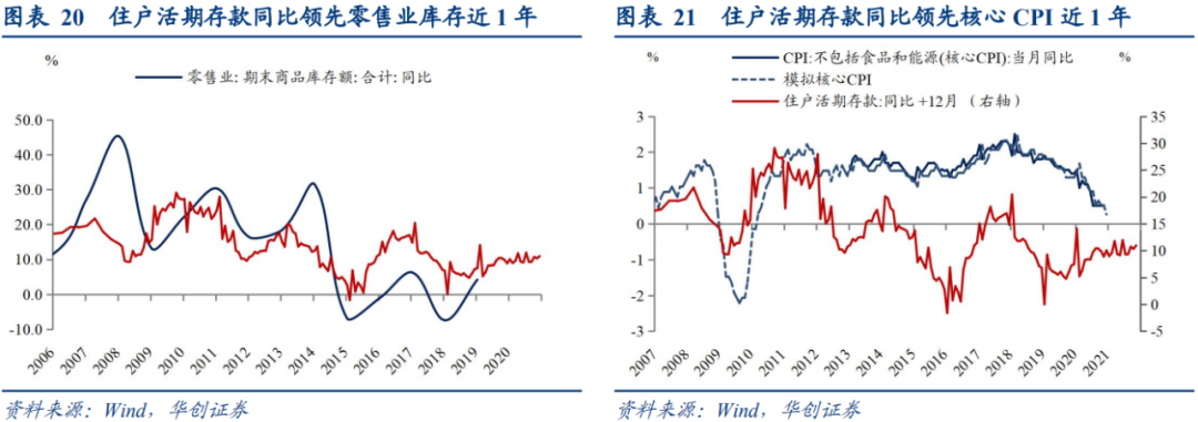 长期来看,类似M1之于工业企业库存和PPI,我们可用居民活期存款前瞻居民的消费积极性、零售业的库存周期和消费品价格变化。从我国的历史数据看,居民活期存款同比稳步领先于零售业库存周期1年,领先于核心CPI同比1年左右。除此之外,居民杠杆率的抬升也基本领先于核心CPI同比1年左右。居民杠杆率抬升往往意味着居民对可选消费品、耐用品的消费需求将有明显增长,典型如地产后周期(家电)、汽车、高端手机等等。2020年稳定持平的居民活期存款增速以及快速抬升的居民杠杆,均说明长期视角核心CPI完全可能回归疫情前的水平。