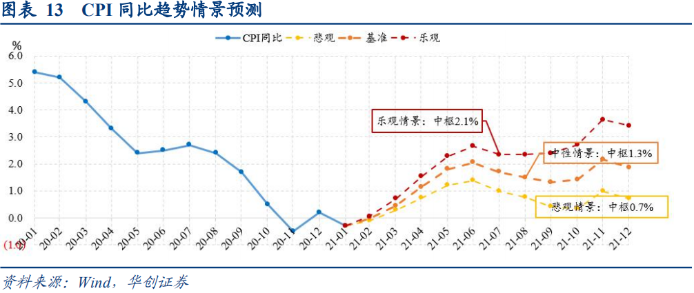 跟随PPI,CPI将成为2021年通胀上行的第二条线索,尤其是非洲猪瘟变异毒株的出现,可能导致2021年上半年CPI攀升斜率上修,上调2021年全年CPI中枢至1.3%左右(此前为1%)。