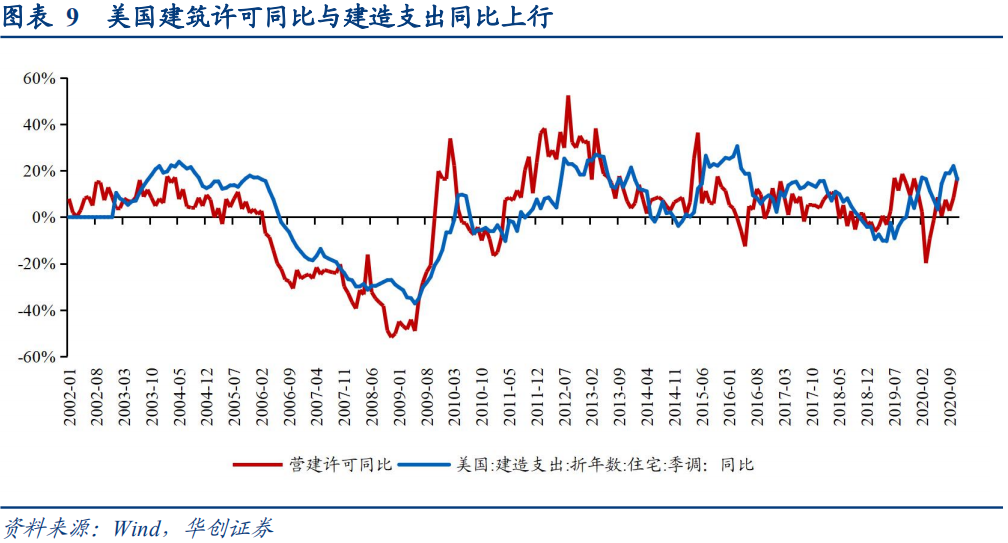 再者,以美国为主要代表的海外楼市正接近历史高点。2020年末,美国房屋建设和销量已经超过疫情前的水平,再创2007年以来的新高,目前的火热程度已经和2002年相当。从去年4月至12月,建筑许可季调折年数上行至170.9万套,较4月上涨60%,并领先带动住宅建造支出同比上升至16%的水平。结合建筑商信心扩散指数来看,后期建筑施工对上游商品的需求还将持续扩大。