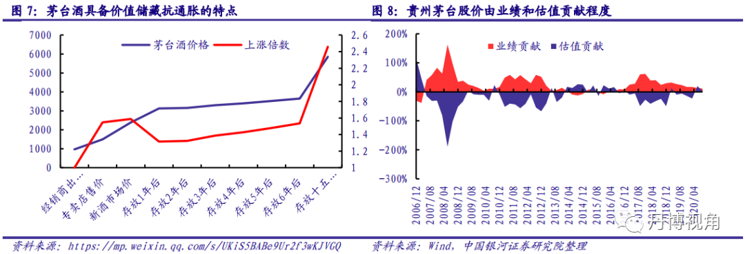 第三个就是类货币属性,茅台具有价值储藏抗通胀的特点,茅台老酒的价格可以轻松跑赢通胀,而且再存放一定年份以后,价值增长加速。因此其价值储藏的特征也进一步促进了茅台拥有广阔的市场,提供业绩保障。
