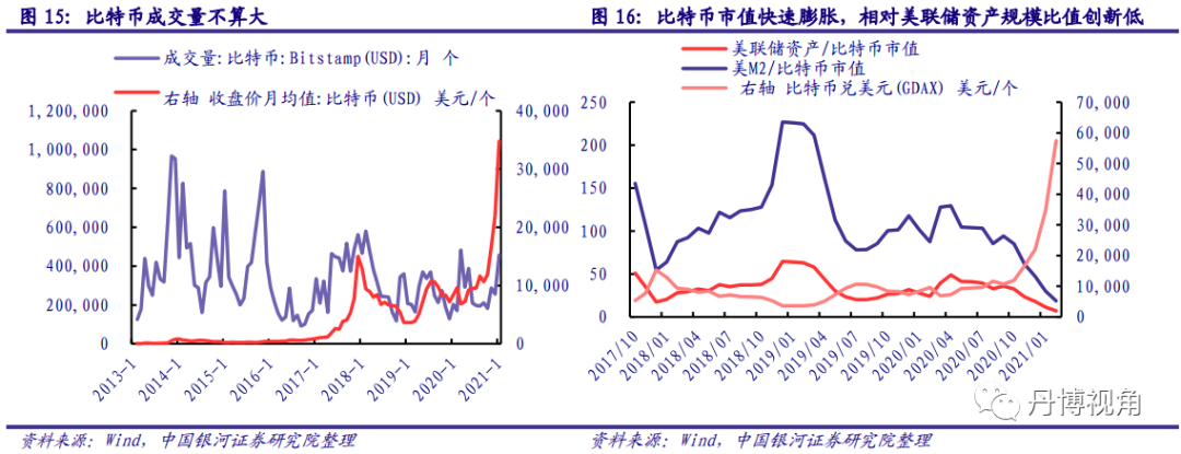 如果比特币真正作为货币来发展,未来比特币增长的空间也并不是没有天花板,这个天花板我们认为就是美联储的资产负债表规模。随着比特币市值与美联储资产规模相比,比值不断的下降,其风险也在加大。现在看来,仍有上涨空间,但我们认为的确应当关注潜在的政策风险。