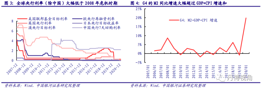 2020年全球量化宽松的新特点:1、相对于GDP央行扩表规模更大;2、利率水平更低和更高的M2;3、M2增速大幅超过GDP+CPI增速。