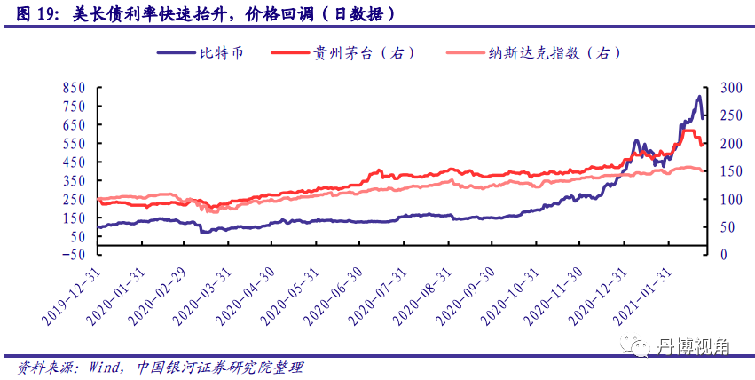 从股债性价比来看,近期经济复苏及通胀预期推升美债收益率快速抬升,超高估值的权益资产尤其是科技股估值有调整压力,经济复苏主线将更有利于顺周期行业和受疫情影响前期滞涨的板块。与高估值的科技股表现相类似,比特币和贵州茅台股价也将面临阶段性的调整风险,但不否认仍然是长周期的优质资产。