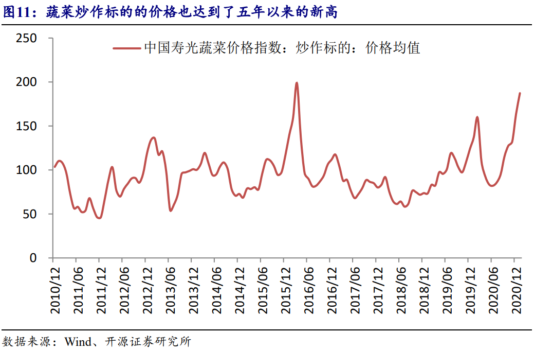 当前这些“靶心”蔬菜的炒作标的的价格已经显著上涨,这可能意味着通胀交易正在开始,也意味着后续一轮消费品通胀周期的到来。