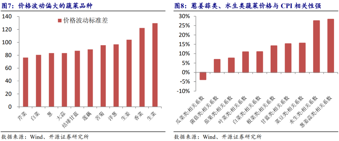 2)这些容易被炒作的蔬菜品种往往符合必需品、市值小、易于储存这三个特性,且其价格波动偏大,价格与CPI食品周期相关性强;