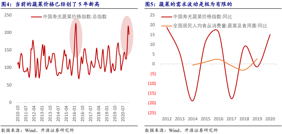 2)那么,即使当前的蔬菜价格创了5年新高,也可能是一个转瞬即逝的现象。首先, 需求即使能成趋势,但其早已不是蔬菜价格的主导项。蔬菜这一品种本是刚需,其需求波动是极为有限的,自然无法解释蔬菜价格相对大幅的价格波动;其次, 即使蔬菜的供应出现收缩,但考虑蔬菜本身的种植时间极短,且相互替代性极强,供给也不会让蔬菜价格持续高企下去。
