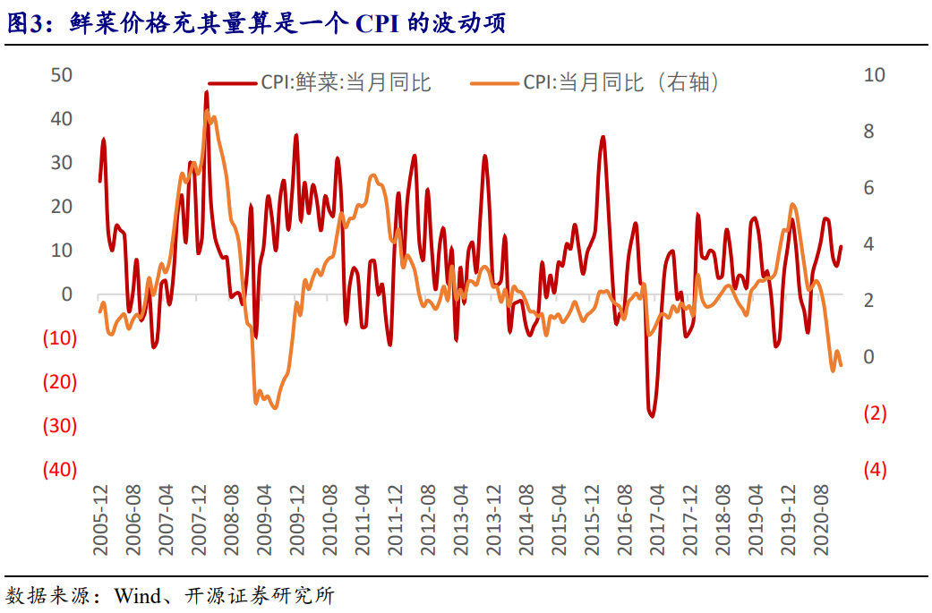 在分析通胀趋向时,我们往往会选择性忽视蔬菜价格,的确从成分法的角度看,蔬菜价格对通胀并不构成必然影响。