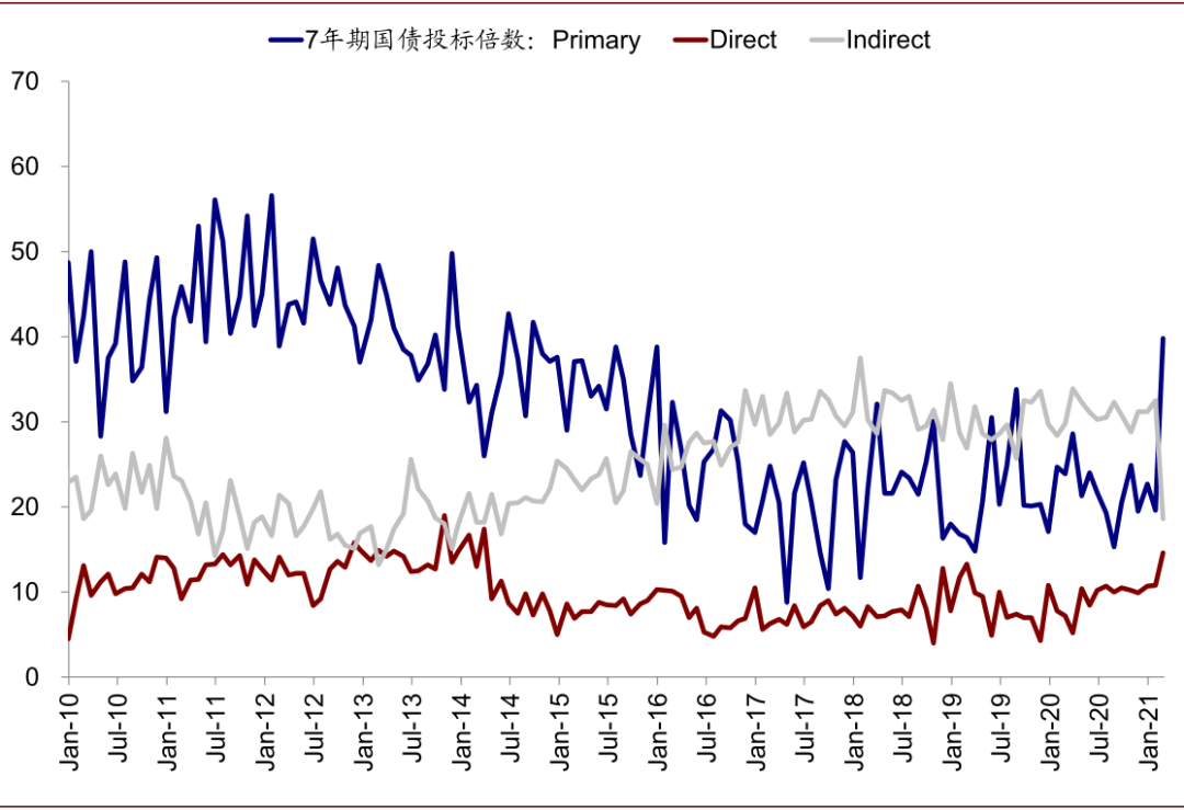 3)美联储对银行机构投资国债资本充足率豁免要求的到期可能会阶段性影响需求。疫情期间,美联储为缓解国债市场流动性压力,允许大型金融机构可以不将持有国债纳入资本充足率计算中,但这一豁免3月底截止[1]。截止三季度,美国银行机构持有国债1.3万亿美元,占到总存量规模的5.5%,相比疫情前新增2850亿美元。我们目前不清楚美联储是否会延长这一豁免,但如果取消的话,在美国银行目前资本充足率处于历史新高的背景下,可能更多体现为降低对国债的需求。近期财政部国债拍卖竞拍率下降不排除是一个先兆,值得关注。