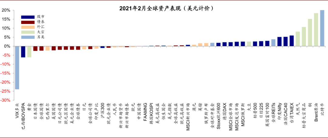图表: 2月全球大类资产表现:美元计价下,大宗>股>债;比特币、原油、铜、天然气、法国股市等领先;VIX多头、巴西股市、黄金、债券等落后