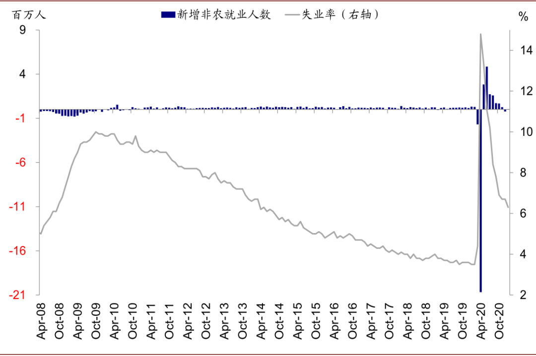 图表: 近1000万人的就业缺口因疫情因素还未恢复,即便按照2020年5月以来美国就业市场每月新增138万人的平均速度,完全修复这一缺口也需要7个月