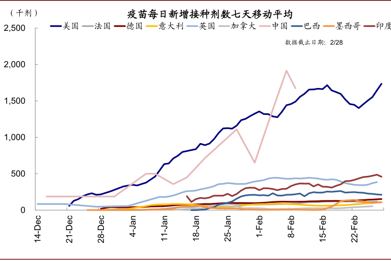 2)财政刺激预期基本计入后也或等待下一个催化剂。1.9万亿美元的财政刺激在2月初民主党人决定使用预算调节程序后便基本是板上钉钉(《美国新一轮财政刺激渐行渐近》),1月初和2月以来美债利率两轮走高也都与此有关。因此,从市场角度而言,未来(我们预计在近期一两周)1.9万亿美元的财政刺激,从市场预期角度也不算新增预期,反而是预期兑现了。接下来,可以关注下一个催化剂,如拜登提交2022年(2021年10月开始)新一财年预算案中(预计4~5月)是否会给出大规模的基建投资计划,以及疫苗接种的里程碑式进展(每天200万剂的速度可以在今年夏天左右实现70%的人口覆盖)。