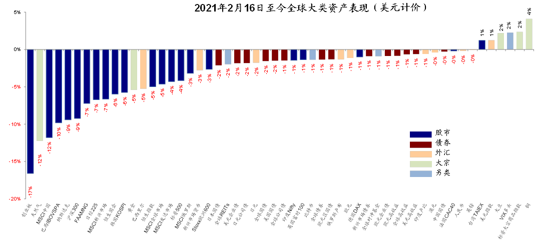 此外,OPEC决定延长减产推动油价大涨可能也起到了一定的助推剂的效果。在此影响下,美股市场普遍回调,特别是高估值的成长股。同时,美元大涨至91.6,黄金大幅下跌,这些走势与我们在本周初刚发表的3月海外资产配置月报中给出的判断一致(《海外资产配置月报(2021-3):阶段性扰动,还是系统性拐点?》)。