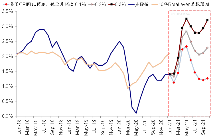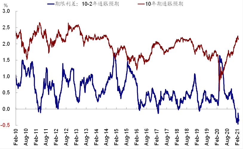 实际上,细究Powell的发言,其实并没有和之前有太多的不同,比如表示预期将看到通胀在基数效应下的短期走高(inflation move up through base effects),带来一定的价格上行压力(create some upward pressure on prices),但依然表示不认为通胀会持续或大幅的处于2%以上(not staying up and certainly notstaying up to the point where they would move inflation expectations materiallyabove 2%),上述这些表态实际上与过去一段时间包括在国会听证会上的措辞是基本一致的。