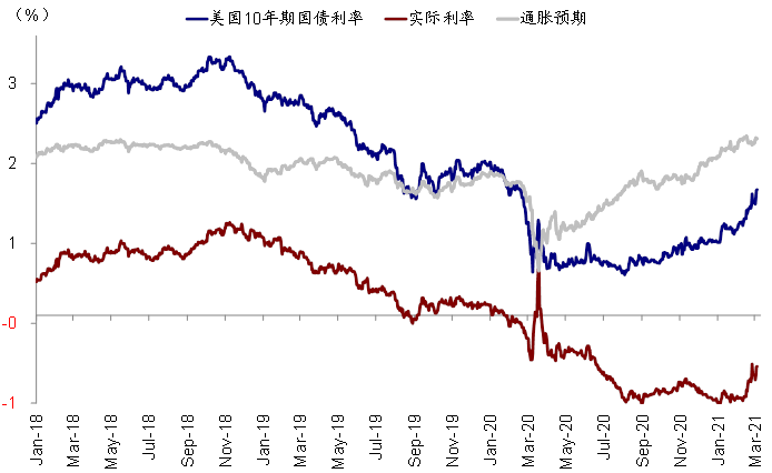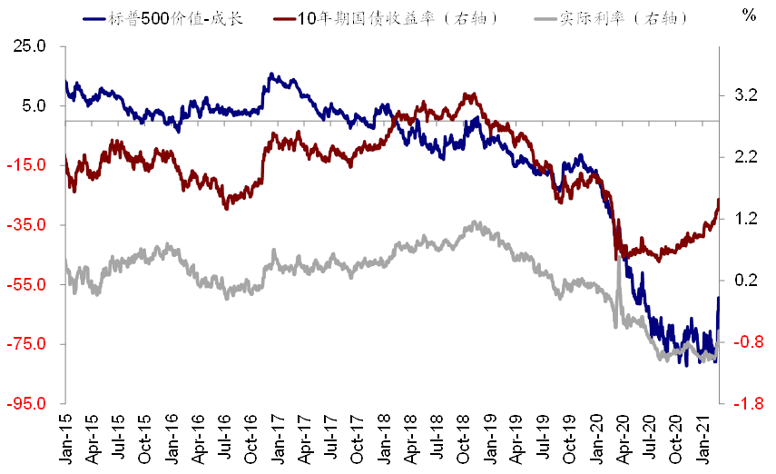 那么,实际利率上行究竟意味着什么?简言之,实际利率即代表扣除价格之后的实际增长预期,也反映了实际的融资和杠杆成本。因此,实际利率的快速走高(即便大幅为负),短期内不利于黄金,因为在真实回报率抬升的背景下,现金流为“负”的黄金资产吸引力下降。其次,对高估值部分的边际影响相对更大一些。实际利率抬升意味着实际的融资成本走高,对企业融资或杠杆都是如此,因此对于高估值、拥挤交易部分的边际影响相比单纯通胀预期抬升时更大(例如去年下半年),这也是近期美股高估值的纳斯达克和成长风格承压而去年下半年整体平稳的原因之一。