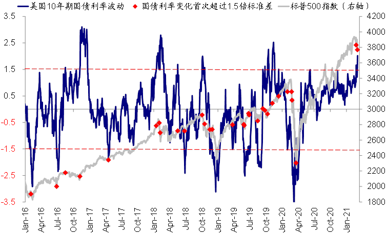 从历史经验来看,向上突破1.5倍的标准差后,往往会对市场造成扰动。如果进一步触发止损盘、程序化交易和衍生品头寸的平仓等连锁反应的话,更会进一步放大波动,因此短期内美债利率和资产价格本身的变化值得密切关注(《美债利率上行过快的挑战》)。