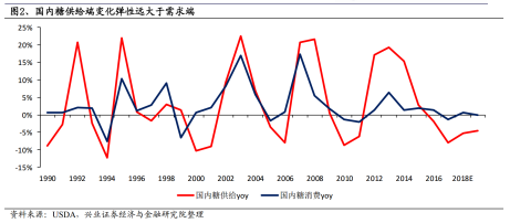 通过比较国内糖消费与供给增速变化发现,供给端弹性远大于需求端,尤其2008年后国内糖消费趋于稳定,供给端对于糖价影响程度增加。