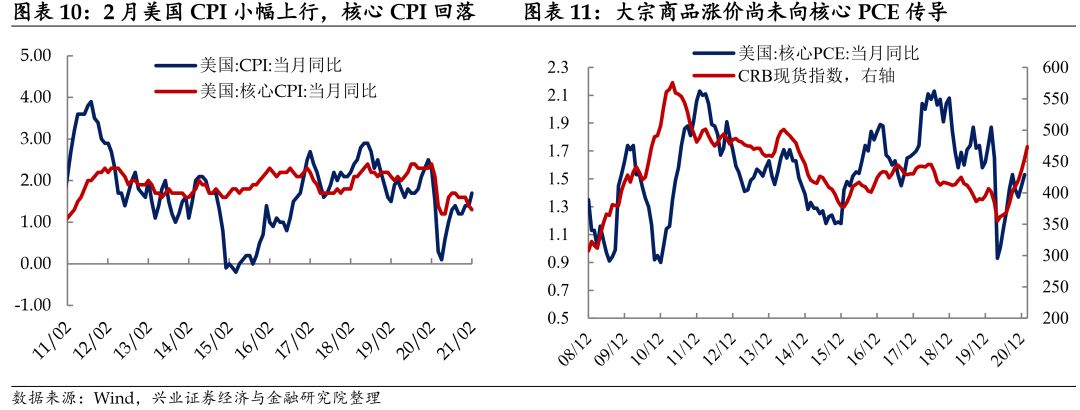 通胀预期回升更多是国内债市中期(3季度及以后)需要考虑的因素。一方面,2月美国CPI由1.4%升至1.7%,核心CPI由1.4%降至1.3%,核心CPI回落意味着美国目前通胀风险整体可控。另一方面,大宗商品通胀到核心通胀的传导可能需要4-5个月,核心通胀回升到美联储态度转鹰也有4-6个月的时滞,因此当前大宗商品上涨并不会改变当前美联储的鸽派态度,今年三季度将是市场与联储博弈的关键时间窗口。从“海外核心通胀回升—美联储应对—国内央行应对”的链条看,需要一定的时间,通胀变量对国内债市而言可能更多是中期(3季度及以后)需要考虑的因素,短期更多是个扰动项。